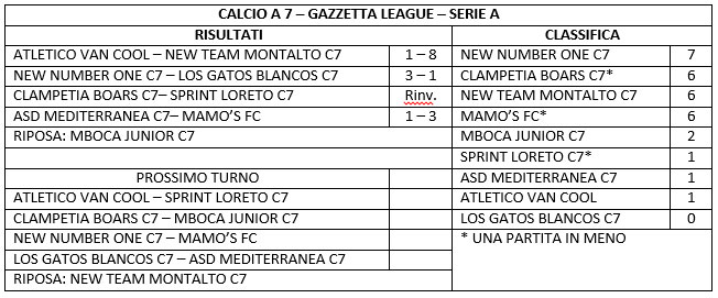 Partito il Campionato di Calcio a7 Serie A Open Maschile – Gazzetta League,  già dalla prima giornata le compagini si sono affrontate a viso aperto. Nella partita inaugurale l’Atletico Van Cool andata in vantaggio nel primo tempo con Bisceglia Francesco, si è fatta recuperare a soli 5 minuti dalla fine dal Mboca Junior C7 con il gol del presidente Porco Ubaldo Valentino, 1-1 risultato finale. Nella seconda partita si sono affrontate l’Asd Mediterranea C7 e la New Number One C7, partita ricca di emozioni fino all’ultimo minuto. La mediterranea in vantaggio di 3 reti a 2 si fa raggiungere su penalty dal sublime Carbone Omar che sancisce e agguanta un pareggio ormai insperato dopo le tante occasioni sprecate. Finale 3-3. Belle  e ricche di gol anche gli incontri tra Los Gatos Blancos C7 – Mamo’s FC e New Team Montalto C7 – Clampetia Boars C7, entrambe finite col punteggio di 2-3. Nella seconda giornata spiccano le vittorie di New Number One, 5-1 sui sfortunati ragazzi di mister Biagio Politano (Atletico Van Cool) che hanno tenuto in vita la gara solo per un tempo e che poi nel secondo tempo, anche per i numerosi infortuni, si sono dovuti arrendere agli avversari. Partita sempre in bilico invece tra Los Gatos Blancos C7 e Clampetia Boars C7 finita 0-2 grazie al gol decisivo di Manuel Matteo Cataldi. New Team Montalto C7 – Asd Mediterranea C7 è stata decisa dal bomber Ettore Cristiano che con 4 reti delizia gli spettatori al seguito. Finale 6-3. Pecca di inesperienza la Mboca Junior C7 che chiude il primo tempo sul 0-3 contro uno Sprint Loreto mai rassegnato, infatti i ragazzi di mister Francesco Antonio Micino agguantano un pareggio insperato, le emozioni fino all’ultimo secondo non sono mancate ma alla fine il risultato rimane inchiodato sul pari, finale 4-4. Nella terza giornata, invece, il New Number One C7 e il Mamo’s FC hanno vinto entrambe con il risultato di 3-1  portandosi nelle zone alte della classifica. Vittoria facile invece per la New Team Montalto C7 che con un sonoro 8-1 liquida l’Atletico Van Cool grazie alle triplette di Andrea Pignataro e Eugenio Forte che hanno fatto impazzire i difensori avversari. Rinviata Clampetia Boars C7 – Sprint Loreto C7.