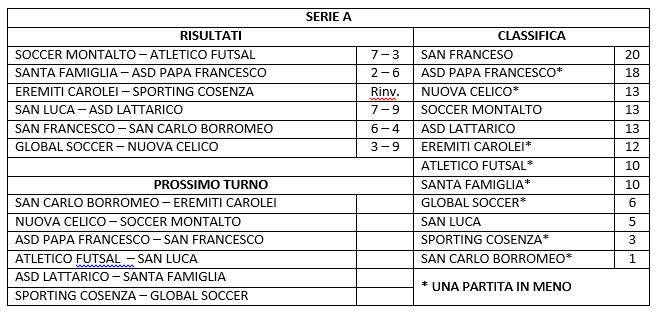 Segue sul secondo gradino del podio il Papa Francesco, che al Palazzetto di Donnici rifila al Santa Famiglia una cocente sconfitta, una gara che ha visto gli ospiti rimanere sempre in vantaggio sugli avversari che le hanno provate tutte per rientrare in partita, non ultimo il portiere di movimento che però non ha sortito gli effetti sperati prestando il fianco agli ospiti che con il portiere Romano Alessandro autore di una doppietta mette in cassaforte il risultato, finale 2-6. La terza piazza se la dividono in tre, Nuova Celico, Soccer Montalto, Asd Lattarico. La Nuova Celico in trasferta batte la Global Soccer, mai in discussione la gara che vede gli ospiti mettere già al sicuro il risultato nella prima frazione di gara per poi gestire il risultato nella ripresa, mattatore della gara Pantusa Francesco che mette ben sette volte il suo nome nel tabellino dei marcatori, finale 3-9. Nello scontro diretto tra Soccer Montalto e Atletico Futsal sono i ragazzi di Montalto ad avere la meglio, dopo un primo tempo di equilibrio assoluto tra le due squadre, il secondo tempo e tutto di marca dei locali che grazie alla doppietta di Crivaro Franco portano a casa questa preziosa vittoria, finale 7-3. Vittoria esterna per l’Asd Lattarico che in quel di Carolei ha la meglio sul San Luca, partita dai due volti con i locali che chiudono in vantaggio il primo tempo, secondo tempo invece appannaggio degli ospiti che dapprima agguantano il pareggio e poi il vantaggio definitivo grazie ad un superbo Lanzillotta Armando che mette a segno ben otto goal, finale 7-9. Rinviata Eremiti Carolei – Sporting Cosenza.