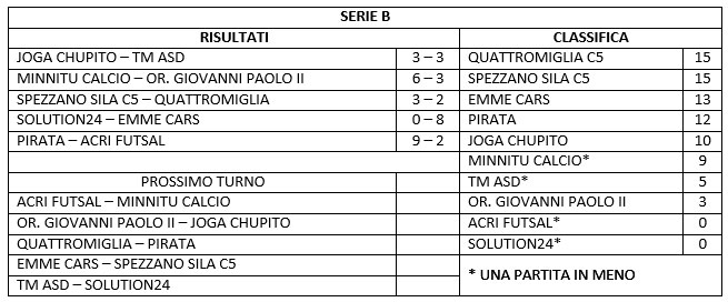 In serie B cade la capolista Quattromiglia C5 che big match di giornata viene sconfitta fuori casa dallo Spezzano Sila C5 che li raggiunge in vetta, una gara molto tattica tra due ottime squadre, l’equilibrio è regnato quasi per tutta la gara fino a quando Ciancio Antonio a messo a segno la rete che permette ai ragazzi di Spezzano Sila di portare a casa la gara e godersi la prima piazza in coabitazione con i diretti avversari, finale 2-3. Dopo le due battistrada troviamo l’Emme Cars che in trasferta batte il fanalino di coda Solution24, una gara a senso unico con i locali che ancora una volta devono alzare bandiera bianca contro gli avversari che grazie alla doppietta di Pellicori Andrea conquistano i tre punti, finale 0-8. Al terzo posto si conferma Pirata che tra le mura amiche sconfigge l’Acri Futsal che riesce a fronteggiare l’offensiva avversaria solo nel primo tempo prima di affondare nel secondo tempo sotto i goal di Turco Valentino ben cinque goal per lui che permette ai suoi di ottenere l’intera posta in palio, finale 9-2. Lo Joga Chupito non va oltre al pari in casa contro il TM Asd due squadre che hanno dato spettacolo in campo con continui capovolgimenti di fronte e tantissime occasione da entrambi le parti, su tutti spicca la prestazione di Calvano Marco del Tm autore di una tripletta, finale 3-3. Vittoria casalinga del Minnitu Calcio che sconfigge l’Oratorio Giovanni Paolo II, una vittoria corale quella dei locali conquistata contro un buon avversario che nonostante la doppietta di D’Ippolito Manuel non riesce ad impensierire i ragazzi di Celico che conquistano la vittoria, finale 6-3.