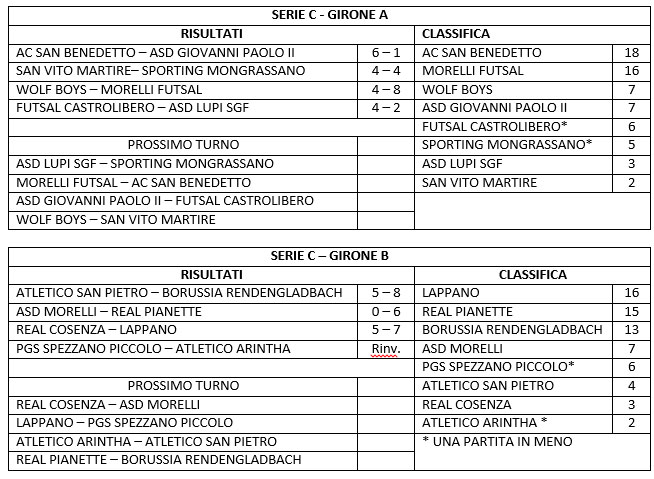 In serie C girone A, continua la corsa della capolista AC San Benedetto che conquista la sua sesta vittoria consecutiva in casa contro l’Asd Giovanni Paolo II, un ruolino perfetto quello dei ragazzi di San Benedetto che anche in questa giornata si sbarazzano facilmente dell’avversario, a trascinare la squadra è Ventura Francesco autore in questa occasione di due goal, finale 6-1. Segue a ruota il Morelli Futsal che in quel di Zumpano ottiene una preziosa vittoria contro i Wolf Boys, gara già in cassaforte nel primo tempo per gli ospiti che poi gestiscono l’incontro fino al termine, match winner della gara è Rino Francesco che mette a segno ben quattro goal, finale 4-8. Esce dalle zone basse della classifica il Futsal Castrolibero che in casa conquista la vittoria contro l’Asd Lupi Sgf, dopo un primo tempo appannaggio degli ospiti i locali nel secondo escono allo scoperto pareggiando inizialmente la gara e poi riescono a farla propria grazie a Cariati Alessandro che con la sua marcatura mette al sicuro il risultato, finale 2-4. Perfetta parità tra San Vito Martire e Sporting Mongrassano, equilibrio per tutta la durata della gara nonostante entrambe le squadre hanno fatto di tutto per portare l’intera posta in palio nemmeno la tripletta di Bianco Fabio è servita ai ragazzi di Mongrassano per vincere il match, finale 4-4.