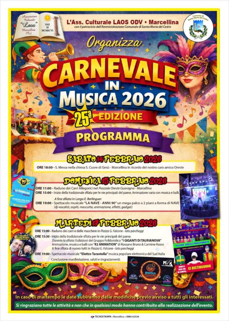 Torna a Marcellina, frazione di Santa Maria del Cedro (Cs), uno degli appuntamenti più attesi dell’anno: il Carnevale in Musica, che nel 2026 raggiunge lo storico traguardo della 25ª edizione. La manifestazione, patrocinata dal Comune di Santa Maria del Cedro, si svolgerà nei giorni 14, 15 e 17 febbraio 2026, con tre intense giornate dedicate alla tradizione, alla musica e al divertimento, coinvolgendo l’intera comunità e numerosi visitatori.