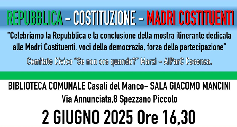 Domani, 2 giugno 2025, in occasione della Festa della Repubblica, si terrà a Casali del Manco l’evento conclusivo della mostra itinerante “Le Madri Costituenti”, un progetto di memoria civile che nelle scorse settimane ha attraversato diversi centri della Calabria, raccontando le vite e il contributo delle 21 donne che nel 1946 entrarono a far parte dell’Assemblea Costituente.