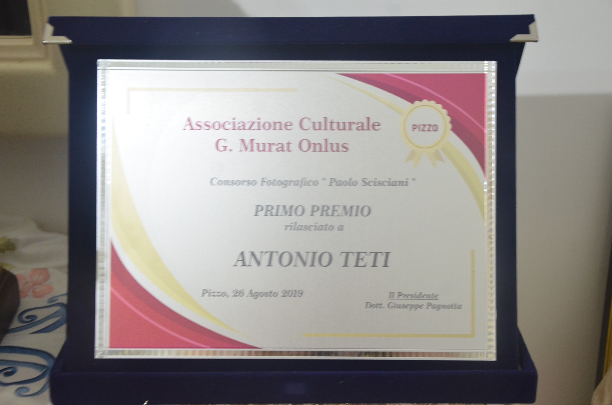 In occasione dell’ultima Giornata Murattiana annualità 2018, alla presenza di un folto pubblico sono stati assegnati i premi del Concorso fotografico “Paolo Scisciani”. Il vincitore del Primo Premio è stato Antonio Teti con una bellissima fotografia dove ha colto il momento magico di tutti i Rievocatori Napoleonici che partecipano alle Rievocazioni di Pizzo.