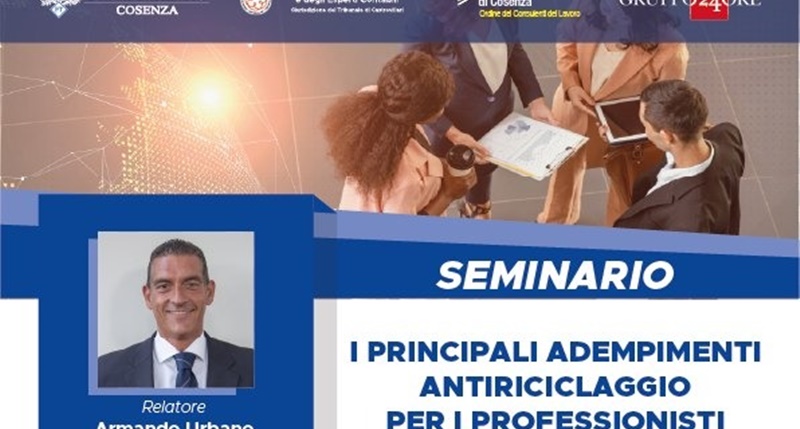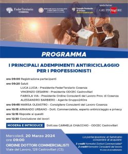 Si terrà mercoledì 20 marzo a partire dalle ore 9 il SEMINARIO ANTIRICICLAGGIO per professionisti a cura di FederTerziario Cosenza, in partnership con l’Ordine dei Dottori Commercialisti ed Esperti Contabili di Castrovillari, il Consiglio provinciale di Cosenza dell’Ordine dei Consulenti del Lavoro ed il Gruppo 24 ORE in qualità di media partner.