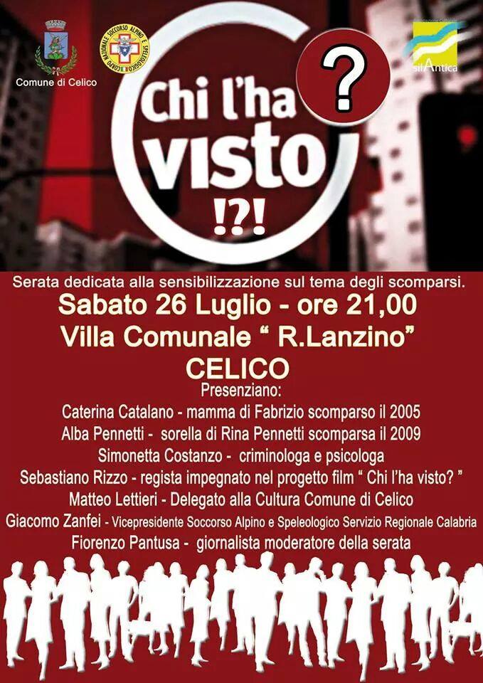 All’evento interverranno: Caterina Migliazza Catalano, madre di Fabrizio Catalano, ragazzo di Collegno (Torino) scomparso il 21 luglio 2005 ad Assisi; Albanascente Penneti, sorella di Rina Pennetti scomparsa il 6 Ottobre 2009 a Rende; Simonetta Costanzo, criminologa e psicologa; Sebastiano Rizzo, regista, impegnato nel film progetto “Chi l’ha visto?”; Matteo Lettieri, Consigliere Comunale con delega alla Cultura del Comune di Celico; Giacomo Zanfei, Vice Presidente Regionale del Corpo Nazionale del Soccorso Alpino e Speleologico. A moderare la serata sarà il giornalista Fiorenzo Pantusa.