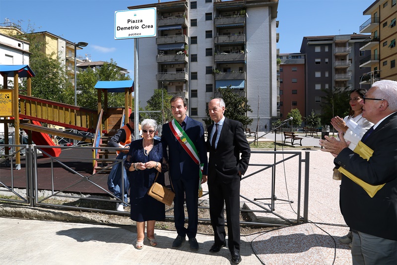 “Abbiamo ricavato una piazza da uno spazio che in precedenza era inutilizzato e adesso invece è molto frequentato da bambini, famiglie, persone avanti con l’età – ha dichiarato il sindaco Occhiuto – E abbiamo inteso intitolarla, con apposita delibera di Giunta comunale sulla toponomastica del 28 novembre 2017, a una personalità come Demetrio Crea, nostro concittadino, per ristabilire quel rapporto che lega il passato alla nostra azione di governo contemporanea. In questo caso, parliamo di un uomo illustre che è stato pure consigliere comunale e assessore. Ha svolto in modo eccezionale compiti considerati normali, sempre con passione e un amore che ne hanno contraddistinto l’esistenza”.