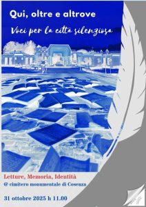 In collaborazione con la studiosa Gina Venneri, l’Associazione “Civica Amica” ha proposto una lettura di poesia commemorativa dal titolo “Qui, oltre e altrove. Voci per la città silenziosa”. Le letture avranno luogo intorno al cippo dedicato a Francesco Saverio Salfi, attorniato da tombe monumentali e di nomi illustri di famiglie cittadine. L’evento si aprirà con la lettura di una poesia Giuseppe Carrieri, figura indissolubilmente legata all’Accademia Cosentina e alla Biblioteca Civica della città. Nella sua raccolta “Fantasime” il termine cimitero ricorre innumerevoli volte, intrecciando riflessione filosofica e immaginario funebre.