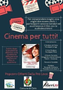 La prima proiezione, fortemente voluta da Riccardo Cristiano, sarà interamente accessibile alle persone cieche. Per l’occasione i partecipanti saranno bendati e potranno ascoltare, proprio come una persona non vedente, il film con le audio descrizioni, in questo caso “Qualcosa di buono” del regista George C. Wolfe con la bravissima attrice Hilary Swank. Subito dopo, gli astanti, potranno partecipare al dibattito sulla condizione delle persone cieche e sulle sensazioni provate durante la proiezione. Ospiti della serata Ottavio Zaccaria, Direttore dell’Unione Italina Ciechi della provincia di Cosenza, Giovanni Candido, persona non vedente abitante a Cleto che racconterà la sua personale testimonianza, il Sindaco Giuseppe Longo, il Vice Sindaco Giuseppe Filice, modererà l’incontro Riccardo Cristiano, Presidente di Liberi.tv e Direttore artistico del cineforum invernale cletese, dichiara infatti quest’ultimo: “continua così il filo conduttore iniziato questa estate, all’insegna del superamento dei pregiudizi di qualunque genere e dell’inclusione sociale.