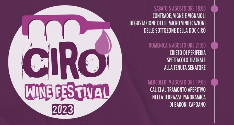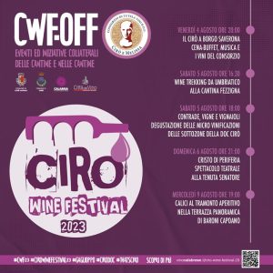 Sarà Borgo Saverona ad accogliere il primo appuntamento in programma venerdì 4 agosto con una cena a buffet, musica e i vini del Consorzio. Il giorno dopo sabato 5 agosto alle ore 16:30 Wine trekking da Umrbiatico fino alla Cantina Fezzigna con aperitivo e degustazione finale dei vini aziendali, mentre alle ore 18:00 “Contrade, vigne e vignaioli” è lo spazio per conoscere da vicino e degustare le micro vinificazioni delle sottozone della Doc Cirò. Domenica 6 agosto spazio al teatro dentro la cantina di Tenuta Senatore con “Cristo di periferia” lo spettacolo di Davide Sacco con Francesco Montanari, abbinato ad una degustazione dei vini dell’areale cirotano. Mercoledì 9 agosto alle ore 19:00 Calici al Tramonto è l’aperitivo proposto da Baroni Capoano sulla terrazza panoramica dell’azienda, con musica dal vivo e degustazione di eccellenze territoriali.