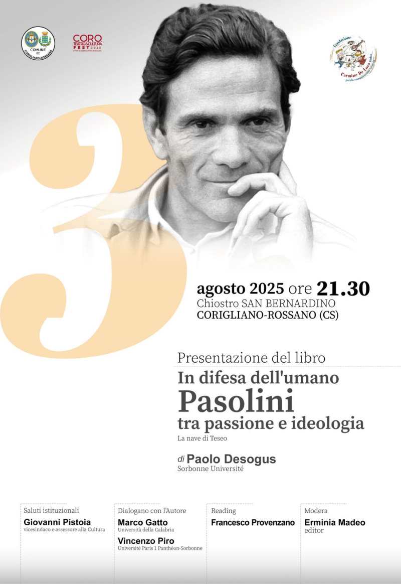 L’occasione del dibattito sarà la presentazione del libro di Paolo Desogus, professore alla Sorbona, “In difesa dell’umano. Pasolini tra passione e ideologia“.