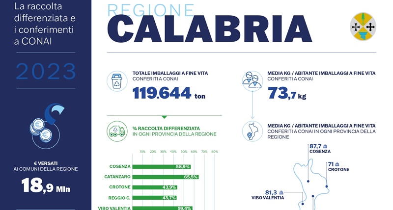 Guardando agli ultimi dati Ispra, la provincia migliore rimane quella di Catanzaro, che differenzia il 65,5% dei suoi rifiuti. Dalla provincia arriva a CONAI un pro-capite di oltre 78 chilogrammi di imballaggi a fine vita.