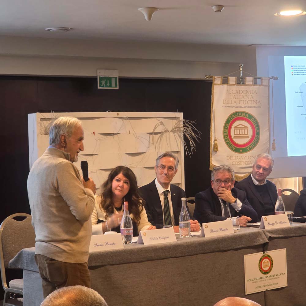 Accademia Italiana della Cucina, presieduta da Paolo Petroni con: il premio Massimo Alberini riconosciuto all’esercizio commerciale Fratelli Nocerino, consegnato ad Antonio Nocerino dal Sindaco della città di Cosenza Franz Caruso che ha inteso testimoniare la propria vicinanza ad una eccellente realtà operante in città; il premio “Dino Villani a Rosa Iaquinta del Panificio Parmella per il prodotto “Pitta ‘Mpigliata”, consegnato da Florindo Rubbettino presidente della rete dei musei d’impresa della Calabria Sudheritage che ha raccontato la storia di uno dei dolci più conosciuti e apprezzati del territorio; il “Diploma di Buona Cucina” al ristorante “L’Oste d’Arberia”, consegnato allo chef Gregorio Antonio Buccolieri dal Direttore Generale dell’ARSAC Fulvia Caligiuri e il premio Giovanni Nuvoletti consegnato al giornalista Gianfranco Manfredi dal Direttore del Centro Studi Territoriale Calabria dell’AIC Ottavio Cavalcanti affiancati dai Delegati di Cosenza Rosario Branda, di Vibo Valentia Eleonora Cannatelli e di Reggio Calabria Giuseppe Alvaro.