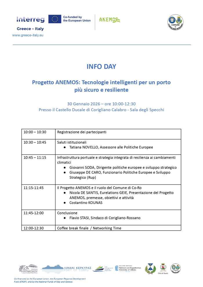Si terrà venerdì 30 gennaio, alle ore 10 presso il Castello Ducale di Corigliano-Rossano, l’info-day del progetto “ANEMOS”.Lo scopo dell’evento è quello di presentare gli obiettivi, le attività e le soluzioni innovative proposte dal progetto, volte a rafforzare la resilienza operativa dei porti dell’Adriatico e dello Ionio contro gli eventi meteorologici estremi. ANEMOS (A Common Cross-border Strategy for Storm Preparedness and Operational Resilience Techniques for Seaports) è un progetto di cooperazione territoriale europea tra Grecia e Italia, cofinanziato dall’Unione Europea nell’ambito del programma Interreg VI-A Grecia–Italia 2021–2027. La partnership riunisce importanti istituzioni pubbliche e accademiche: il Fondo Municipale di Pyrgos, l’Autorità Portuale di Corfù, Fondo Speciale di Ricerca dell’Università di Atene per la Grecia; per l’Italia, la Città Metropolitana di Bari, il Comune di Nardò e il Comune di Corigliano-Rossano. In particolare il progetto promuove una serie di interventi finalizzati ad una gestione sostenibile e resiliente dei porti dei partner coinvolti, attraverso strategie transfrontaliere condivise e l’impiego di tecnologie avanzate, tra cui sistemi di monitoraggio basati su droni e soluzioni di intelligenza artificiale quali strumenti di allerta precoce, prevenzione dei rischi e risposta operativa. Il suo fine ultimo è quello di rafforzare la preparazione agli eventi meteorologici estremi, ridurre i disagi operativi e sostenere la sostenibilità e la competitività a lungo termine delle infrastrutture portuali nell’area transfrontaliera.