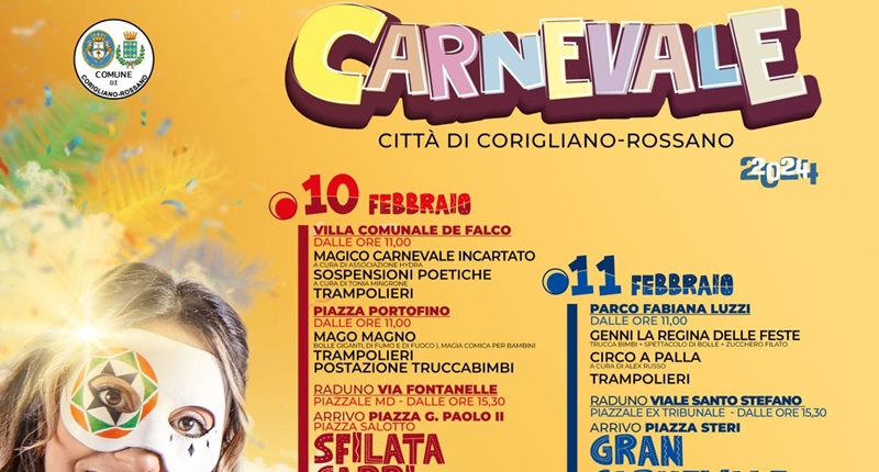 Coriandoli e stelle filanti. Maschere e allegria. È tutto pronto per il Carnevale 2024 della città di Corigliano-Rossano, la festa dove “tutto è permesso”, che quest’anno segna un ritorno alle tradizioni, con le sfilate dei carri allegorici ed un concorso di maschere sotto il simbolo di Clementizia, la maschera ufficiale che l’anno scorso fu scelta dopo un concorso di idee a cui in molti parteciparono sottoponendo ad una giuria di qualità le loro creazioni. “Clementizia” coniuga il binomio fra la clementina e la liquirizia che rappresentano eccellenze enogastronomiche locali, ed al contempo tradizione e identità, colori, profumi e sapori inconfondibili ed inimitabili della Sibaritide. Le tradizioni fanno parte della nostra identità sociale e culturale. Tra queste tradizioni si inserisce il Carnevale che ritorna con il suo carico di allegria e spensieratezza. È stato infatti definito il cartellone, che, nell’ottica propria della festa di Carnevale, ha come focus d’eccezione i bambini e le famiglie.