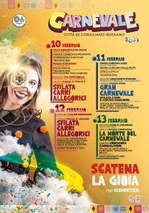 – Martedì 13 febbraio a partire dalle 15.30 la tradizionale siflare de La morte del Carnevale, corteo Gregorij Carnivaleri, con raduno al Liceo Colosimo e arrivo a Piazza Compagna. Seguirà la sfilata in maschera, il concorso “Maschera più bella” e una serie di iniziative di intrattenimento per famiglie.
