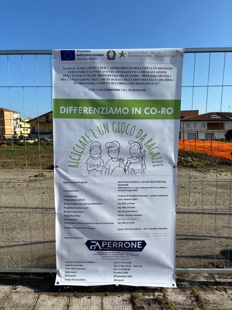 Ed è in questa prospettiva che si sviluppa il progetto “DIFFERENZIAMO IN CO.RO. – Miglioramento e meccanizzazione della rete di raccolta differenziata dei rifiuti urbani” finanziato nell’ambito del Pnrr per un importo di € 526.192,91.