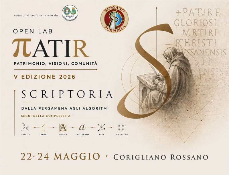 La scrittura sarà il filo conduttore dell’open lab Patir 2026 in programma a Corigliano Rossano il 22-23-24 maggio prossimi. Un leitmotiv capace di rappresentare lo spirito di questa città che scrive, produce sapere e intreccia culture tra Oriente e Occidente, mentre si confronta con le nuove frontiere digitali: le pergamene miniate del Codex Purpureus Rossanensis, patrimonio Unesco; le tracce forti di San Nilo, faro della Cultura e della Cristianità e maestro calligrafo; gli amanuensi del Complesso monastico di Santa Maria del Patire, che dallo scriptorium preservarono memoria e consegnarono bellezza al Mediterraneo e al mondo orientale; il raffinato letterato e calligrafo rinascimentale Giambattista Palatino, uno dei padri della comunicazione moderna e ispiratore dell’elegante carattere omonimo. Sono i “segni” identitari che, nell’epoca della rete e degli algoritmi, consentono di tessere questa articolata narrazione storico-concettuale di Corigliano Rossano come città della scrittura.