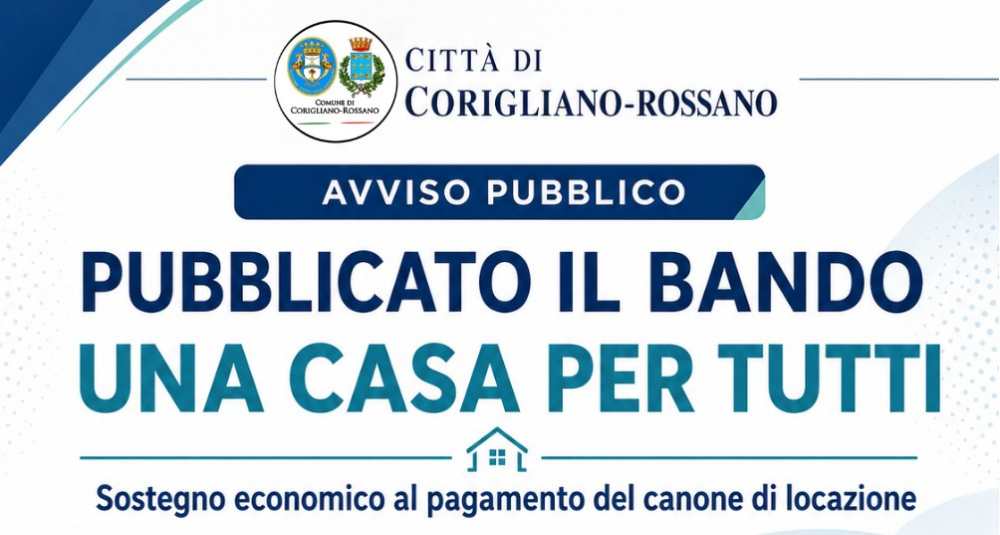 È stato pubblicato sull’Albo pretorio dell’Ente l’avviso pubblico del progetto “Una Casa per tutti” per il sostegno economico al pagamento del canone di locazione, rivolto ai cittadini dell’ATS Corigliano-Rossano.