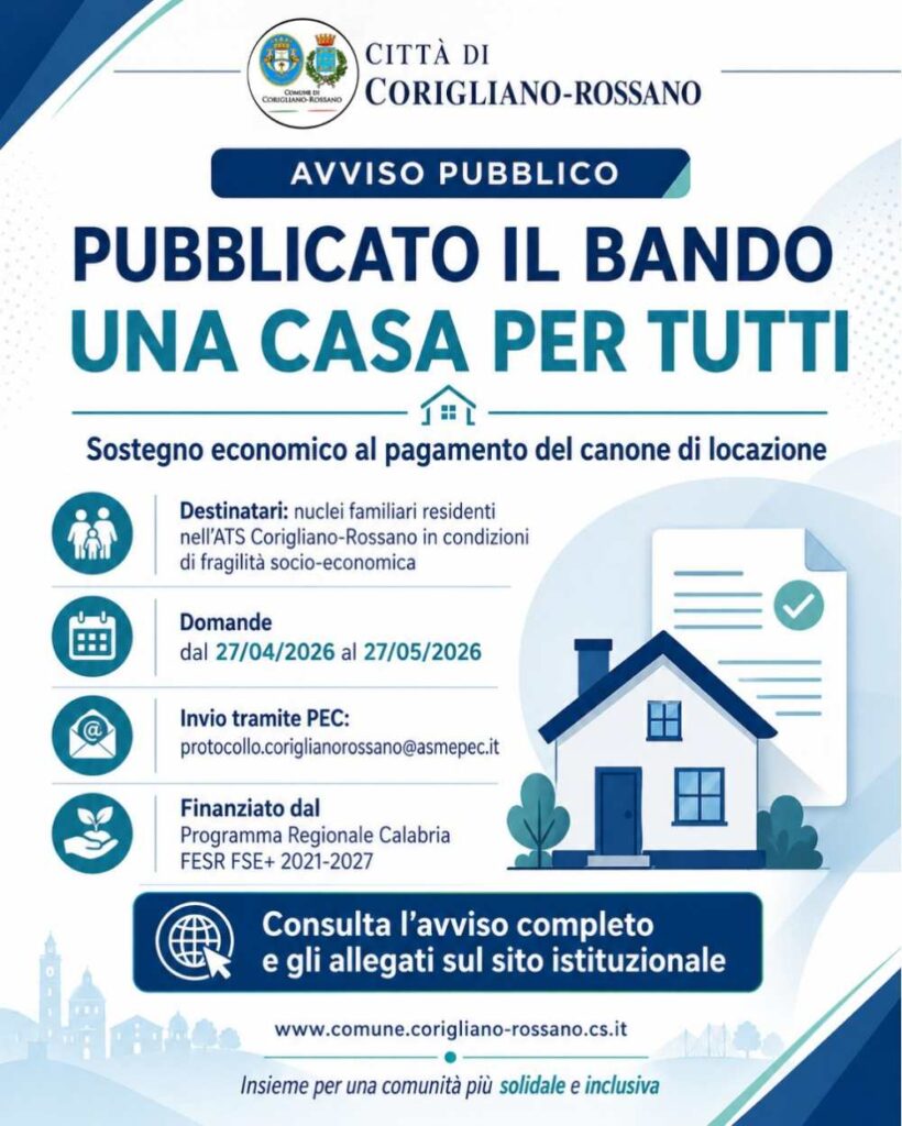 Il testo completo dell’avviso pubblico e i relativi allegati si possono scaricare al seguente link https://www.comune.corigliano-rossano.cs.it/sito/avviso/213925-avviso-pubblico-una-casa-per-tutti