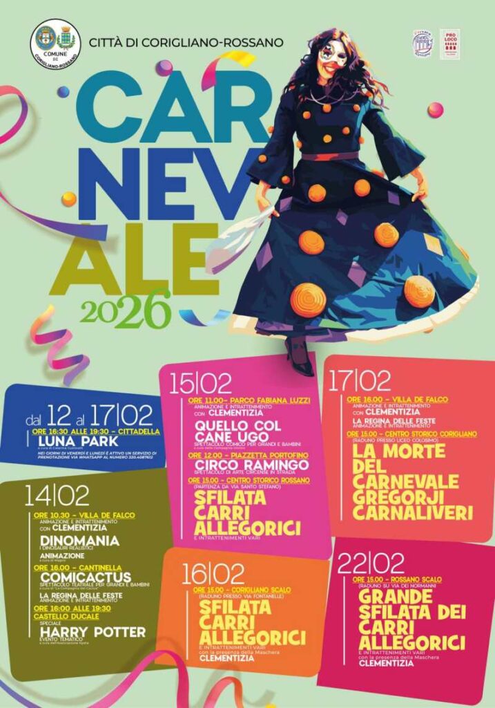 Domenica 22 febbraio grande chiusura del Carnevale 2026. Alle ore 15.00 nuova sfilata dei carri allegorici, con raduno in Viale dei Normanni a Rossano Scalo. Previsti vari intrattenimenti, sarà presente anche la maschera Clementizia.