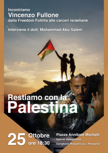 A Corigliano-Rossano (a.u. Rossano), il 25 ottobre alle ore 18:30 in Piazza Annibale Montalti (Sala ex delegazione), si terrà l’incontro “Restiamo con la Palestina”, una serata cruciale di testimonianza e impegno. Interverranno l’attivista calabrese Vincenzo Fullone, co-fondatore dell’agenzia Ain Media Gaza, e il dott. Mohammad Abu Salem. Fullone condividerà la sua provante esperienza: il viaggio con la Freedom Flotilla per portare aiuti umanitari e il successivo fermo illegale da parte dell’esercito israeliano, culminato in cinque giorni di prigionia in un carcere di massima sicurezza.