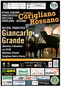 Tutto pronto per il quarto appuntamento della VIII edizione della Stagione concertistica Città di Corigliano-Rossano. Domenica 5 novembre, presso la Biblioteca Pometti nel centro storico dell’area urbana di Corigliano, è in programma il Recital Pianistico di Giancarlo Grande. L’evento, inserito nella kermesse organizzata dall’Istituto musicale Chopin diretto dal maestro Giorgio Luzzi in collaborazione con il Conservatorio Paisiello di Taranto e con il supporto dell’Amministrazione comunale di Corigliano-Rossano, avrà inizio alle 19 con ingresso libero, prima dell’evento ci sarà la possibilità di visitare il Centro Studi “Vincenzo Valente” ed ammirare le opere che il centro conserva nella sua sede.