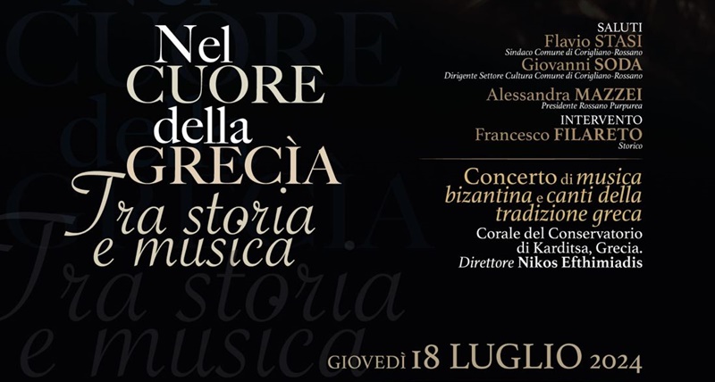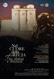 Si terrà sul sagrato della Chiesa di San Marco, nel centro storico di Rossano, giovedì 18 luglio alle ore 20:30, nell’ambito del cartellone del CoRo Summer Fest, l’evento dal titolo “Nel cuore della Grecìa. Tra storia e musica”, per rivivere l’antica atmosfera greca in uno dei luoghi testimoni delle radici bizantine della città