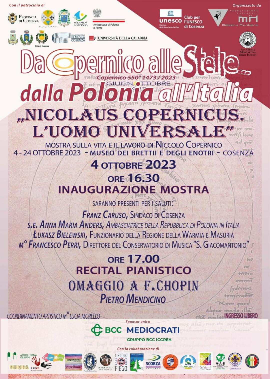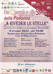 La giornata poi proseguirà con la inaugurazione della mostra sulla iconografia copernicana dal titolo “L’uomo universale”. La mostra sarà inaugurata alle 16,30 presso il Museo dei Bretti e degli Enotri sempre a Cosenza, a cui farà seguito una manifestazione musicale dal titolo “A riveder le stelle, alle ore 19,00, presso il Salone degli Specchi della provincia di Cosenza. A tutte le tre manifestazioni sarà presente Sua Eccellenza Ambasciatrice di Polonia Anna Marie Anders.