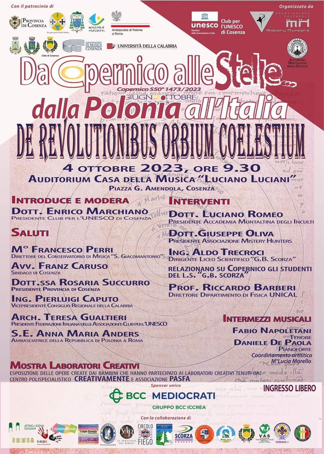 Il primo momento ha come tematica il “Da Copernico alle stelle. Dalla Polonia all’Italia. De Revolutionibus orbium coelestium, previsto per il 4 ottobre, a partire dalle 9,30, a Cosenza, presso l’Auditorium Casa della Musica.