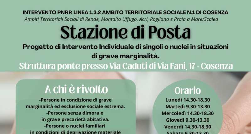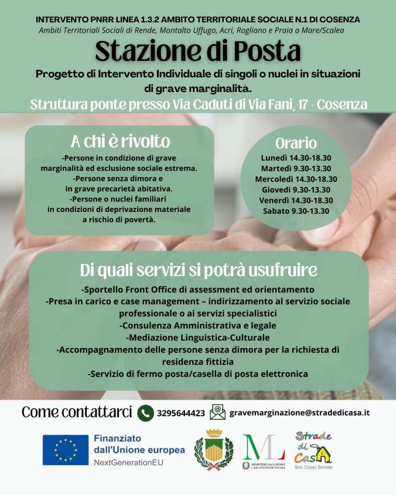 Il nuovo servizio “Stazione di Posta”, è un presidio di accoglienza e orientamento rivolto a persone singole o nuclei familiari che vivono situazioni di grave marginalità ed esclusione sociale. L’iniziativa si inserisce nell’ambito dell’Intervento PNRR Linea 1.3.2 – Ambito Territoriale Sociale n.1 di Cosenza, che coinvolge anche i comuni di Rende, Montalto Uffugo, Acri, Rogliano e Praia a Mare/Scalea, ed è finanziata dall’Unione Europea – Next Generation EU. Il progetto è promosso dal Ministero del Lavoro e delle Politiche Sociali. Ne è titolare il Comune di Cosenza e la gestione è affidata alla Cooperativa Sociale “Strade di Casa” .