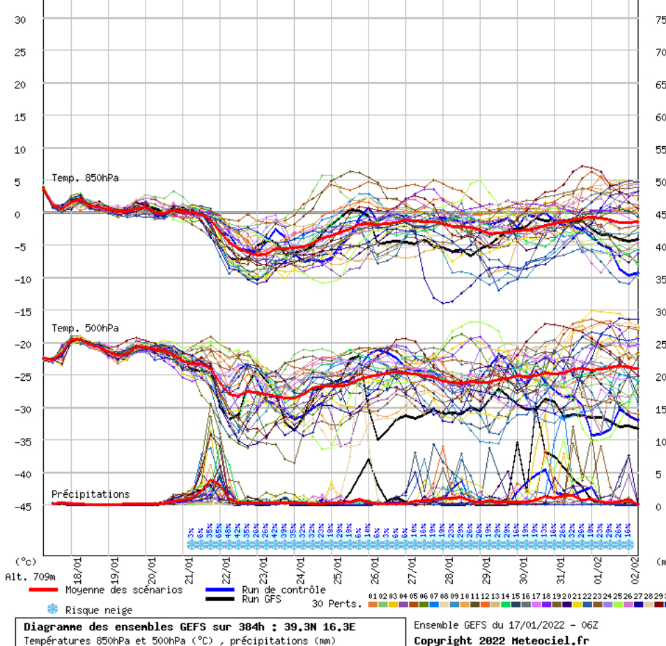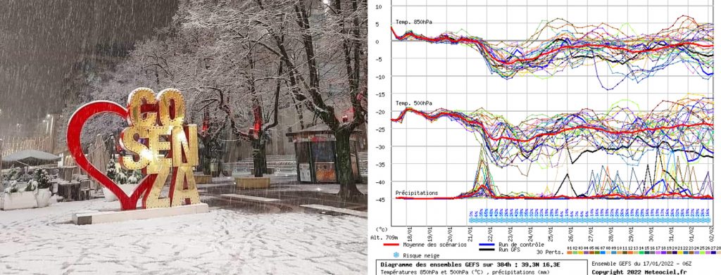 Gli “spaghi” meteo per Cosenza mostrano però un rischio di neve intorno al 65% per la serata nottata di venerdi prossimo come si evince dall’immagine, ricordiamo che questa figura quanto meno spread c’è più la previsione risulta attendibile.