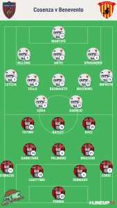 COSENZA (4-3-3): 33 Perina; 2 Corsi, 3 Dermaku, 18 Legittimo, 11 D’Orazio; 21 Bruccini, 6 Palmiero, 24 Garritano; 32 Báez, 16 Baclet, 25 Tutino. All. Braglia