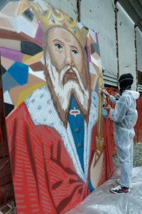 E mentre la nostra “Alice nel paese delle meraviglie”, quasi come un’espansione dell’arte di Jorit, si materializza nella giovane e dolcissima Federica Lo Giudice, e il dj Fabio Nirta anima la piazza con la sua musica, lo street artist indossa i suoi abiti di lavoro e lì comincia a dar vita su un grande pannello, sotto lo sguardo ammirato di tutti, un’altra delle sue ‘opere d’arte’, stavolta è proprio un omaggio alla città e al suo mito, quello di Alarico.