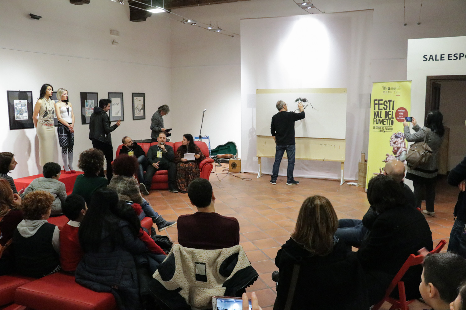 La sezione Off de “Le Strade del Paesaggio”, continuata nelle sale del del Museo del Fumetto, è stata davvero un successo, con il suo alternarsi di residenze d’artista, incontri, e performance all’insegna delle connessioni tra le diverse arti, dal fumetto alla moda fino alla musica. Ospite d’eccezione il “Michelangelo del fumetto” , Tanino Liberatore, che ha raccontato in un appassionante incontro i momenti salienti di una carriera lunga oltre 40 anni, al fianco di enfant prodige come Stefano Tamburini e Andrea Pazienza, regalando ai presenti un live painting emozionante e partecipato e ripercorrendo con una avvincente narrazione la ricca mostra antologica Tratti e ritratti ospitata proprio dal Museo del fumetto fino al prossimo 23 dicembre.