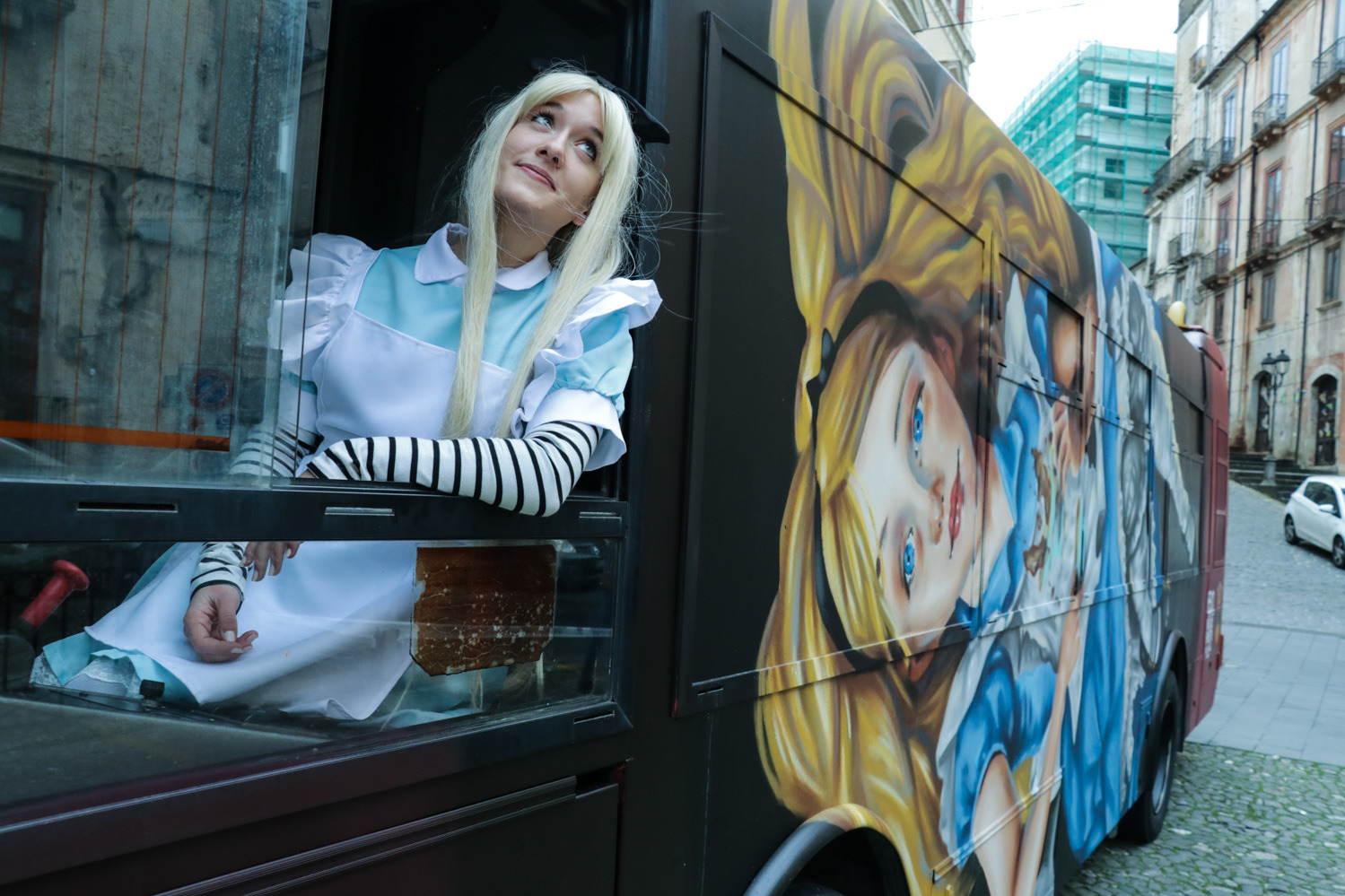Il bus di Alice – così è stato denominato dopo l’intervento artistico di Jorit che l’ha trasformato in un’opera mobile – è arrivato nel centro storico, contestualmente alla sezione Off del Festival Le Strade del Paesaggio, a cura di Cluster Società Cooperativa e Provincia di Cosenza, con il patrocinio del Comune di Cosenza, che sabato scorso ha vissuto la sua lunga giornata inaugurale, all’insegna della creatività d’autore.