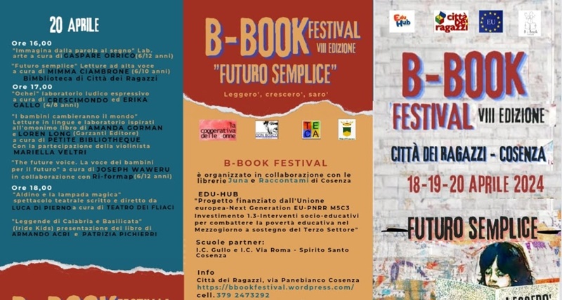 Si svolgerà dal 18 al 20 aprile, alla Città dei Ragazzi di Cosenza, il B-Book Festival, giunto all’ottava edizione. Il festival è organizzato dalla cooperativa delle donne, dalla cooperativa Don Bosco e da TECA srl nell’ambito de progetto “Edu Hub” finanziato dall’Unione europea – Next Generation EU- PNRR M5C3 – Investimento 1.3 – Interventi socio educativi strutturati per combattere la povertà educativa nel Mezzogiorno a sostegno del Terzo Settore. Il tema di quest’anno è “Futuro semplice”, scelto per coniugare i tempi della lettura con quelli della crescita, del divenire, dell’essere. Per sottolineare quanto, immergersi nel mondo fantastico della letteratura, possa definire cornici di senso per i nuovi sguardi che si poggiano sul futuro.