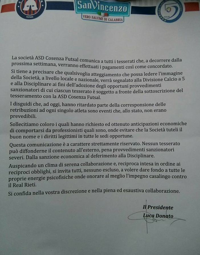 Esattamente una settimana fa, infatti, la società, a nome del presidente (ormai ex) Donato, aveva comunicato ai propri tesserati che, a decorrere dalla prossima settimana, avrebbe effettuato i pagamenti degli stipendi così come concordato avvisando che qualsivoglia atteggiamento potenzialmente lesivo per l’immagine della società sarebbe stato segnalato alla Divisione Calcio a 5 e alla Disciplinare e sottolineando come questa comunicazione fosse a “carattere strettamente riservato. Nessun tesserato può diffonderne il contenuto all’esterno, pena provvedimenti sanzionatori severi”.