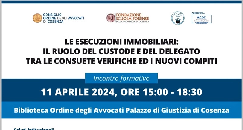 Il convegno formativo “L’esecuzioni immobiliari: il ruolo del custode e del delegato tra le consuete verifiche ed i nuovi compiti” si terrà giovedì 11 aprile alle 15.00, presso la Biblioteca Ordine degli Avvocati Palazzo di Giustizia di Cosenza