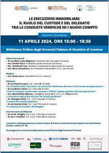 Giovedì 11 aprile alle ore 15.00, si terrà presso la Biblioteca Ordine degli Avvocati Palazzo di Giustizia di Cosenza, il convegno organizzato dall’Associazione cosentina di custodi giudiziari e professionisti delegati alla vendita di beni immobili sottoposti a pignoramento, dal titolo L’ESECUZIONI IMMOBILIARI: IL RUOLO DEL CUSTODE E DEL DELEGATO TRA LE CONSUETE VERIFICHE ED I NUOVI COMPITI.