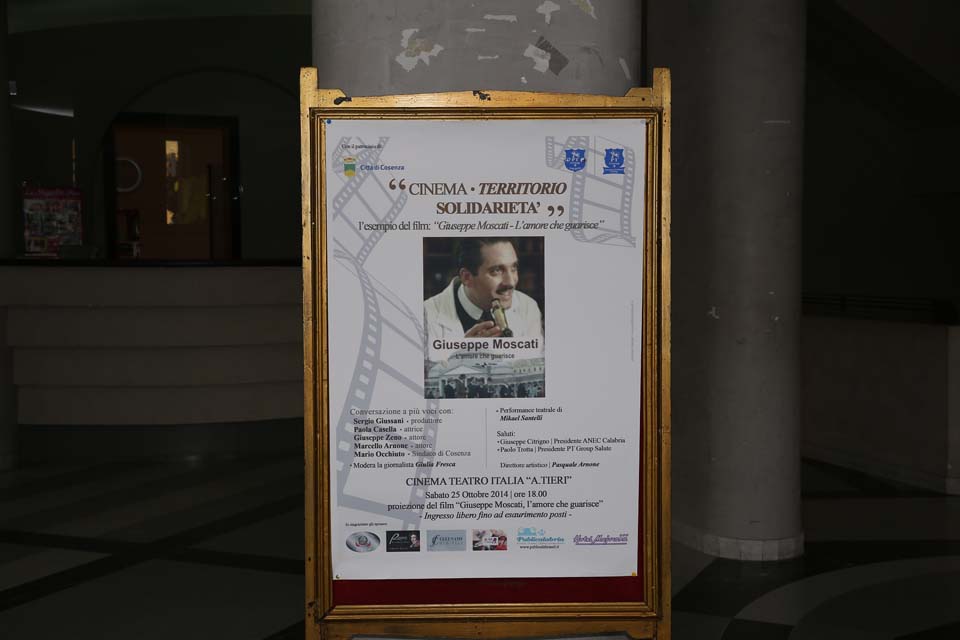 Si è svolto sabato scorso 25 ottobre 2014, presso il Cineteatro Aroldo Tieri, ex Cinema Italia, l’evento “Cinema, territorio e solidarietà” con oggetto il film sulla vita del medico Giuseppe Moscati, organizzato dalla Società Generale Cristiana di Mutuo Soccorso “PT Group Salute” del dott. Paolo Trotta e con la direzione artistica del dott. Pasquale Arnone. Una data particolare, visto che proprio il 25 ottobre, ricorreva l’anniversario della canonizzazione di Giuseppe Moscati da parte di un altro grande Santo, Giovanni Paolo II.