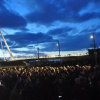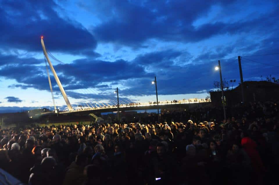 Ora la festa può cominciare. E lo spettacolo multimediale di rara bellezza visiva e di particolare raffinatezza, “Un passo. Sognando la luna”, suscita, nelle migliaia di persone che non hanno voluto in nessun modo mancare all’evento, un mix di emozioni, indotte dalla magia della luce, dagli acrobati e danzatori aerei della compagnia dei Folli (gli stessi di “Matera, capitale europea della Cultura 2019”) e da un finale tutto pirotecnìa ed effetti speciali curato da Parente Fireworks Group nel cui palmares ci sono altri eventi di peso come il concerto di Vasco Rossi a Modena Park e la cerimonia di chiusura di Milano Expo 2015. Prima del taglio del nastro, il prologo quasi felliniano, con l’acrobata (una sorta di Pierrot lunaire) appesa alla luna danzante, in andirivieni continuo tra il Planetario e il vicinissimo Ponte di Calatrava, a ricordare i 50 anni dello storico sbarco di Armstrong ed Aldrin del 1969.
