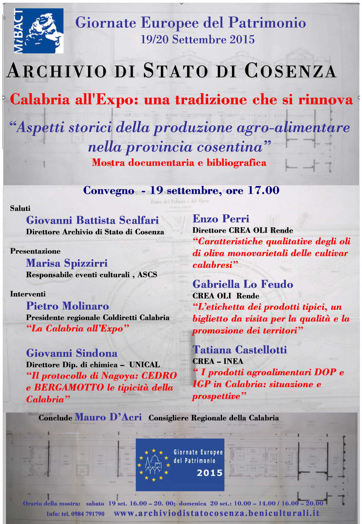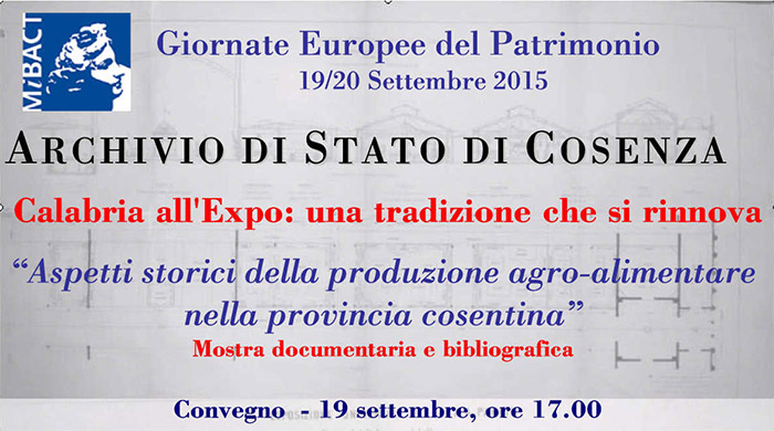 In occasione delle Giornate Europee 2015, che quest’anno ricadono nel periodo dell’Expo, l’Archivio di Stato di Cosenza aderisce alle aperture straordinarie del 19 e 20 settembre con un evento culturale dal titolo “Calabria all’Expo: una tradizione che si rinnova”, articolata in due momenti: il convegno nel quale si parlerà della presenza della nostra regione all’Expo di Milano e saranno affrontate diverse tematiche relative alla produzione agro-alimentare calabrese con particolare riguardo alle peculiarità del nostro territorio; la mostra documentaria e bibliografica dal titolo “Aspetti storici della produzione agro-alimentare nella provincia cosentina”.
