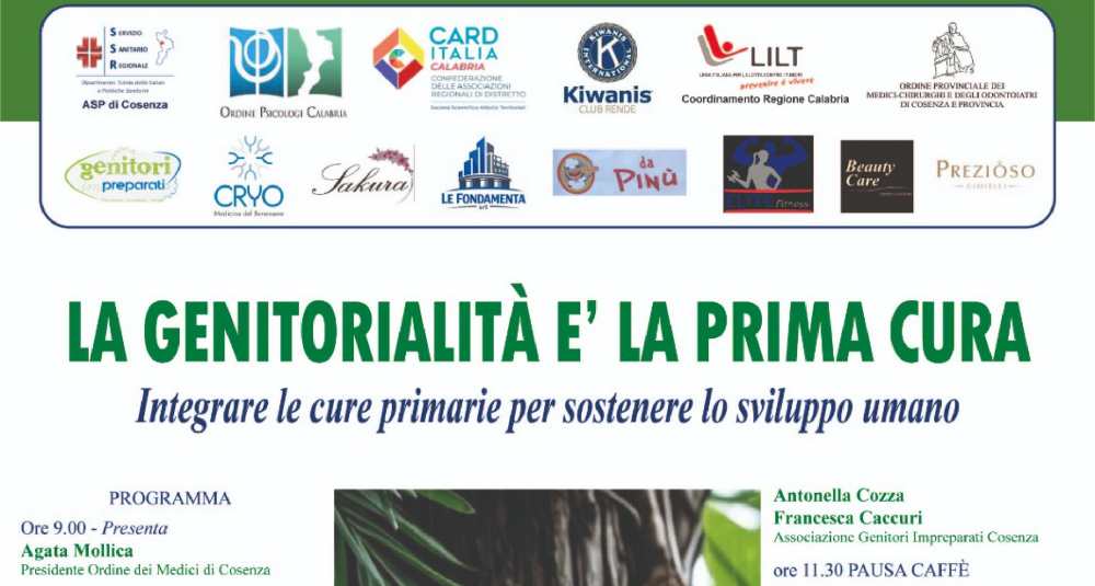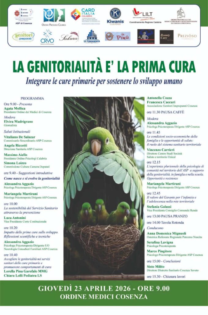 La sanità del futuro non può prescindere dal sostegno al nucleo familiare, inteso come il primo, imprescindibile presidio di salute pubblica. Investire sulla funzione genitoriale non rappresenta soltanto un atto di civiltà, ma costituisce un pilastro fondamentale per garantire la sostenibilità del sistema sanitario e il benessere dell’intera comunità. Su queste basi si sviluppa il convegno “La genitorialità è la prima cura”, promosso dall’ASP di Cosenza con il supporto del Distretto Cosenza Savuto, la collaborazione della CARD, e l’apporto dell’Associazione Genitori Impreparati, che si terrà il prossimo 23 aprile 2026 alle ore 09:00 presso la sede dell’Ordine Provinciale dei Medici – Chirurghi e Odontoiatri di Cosenza.