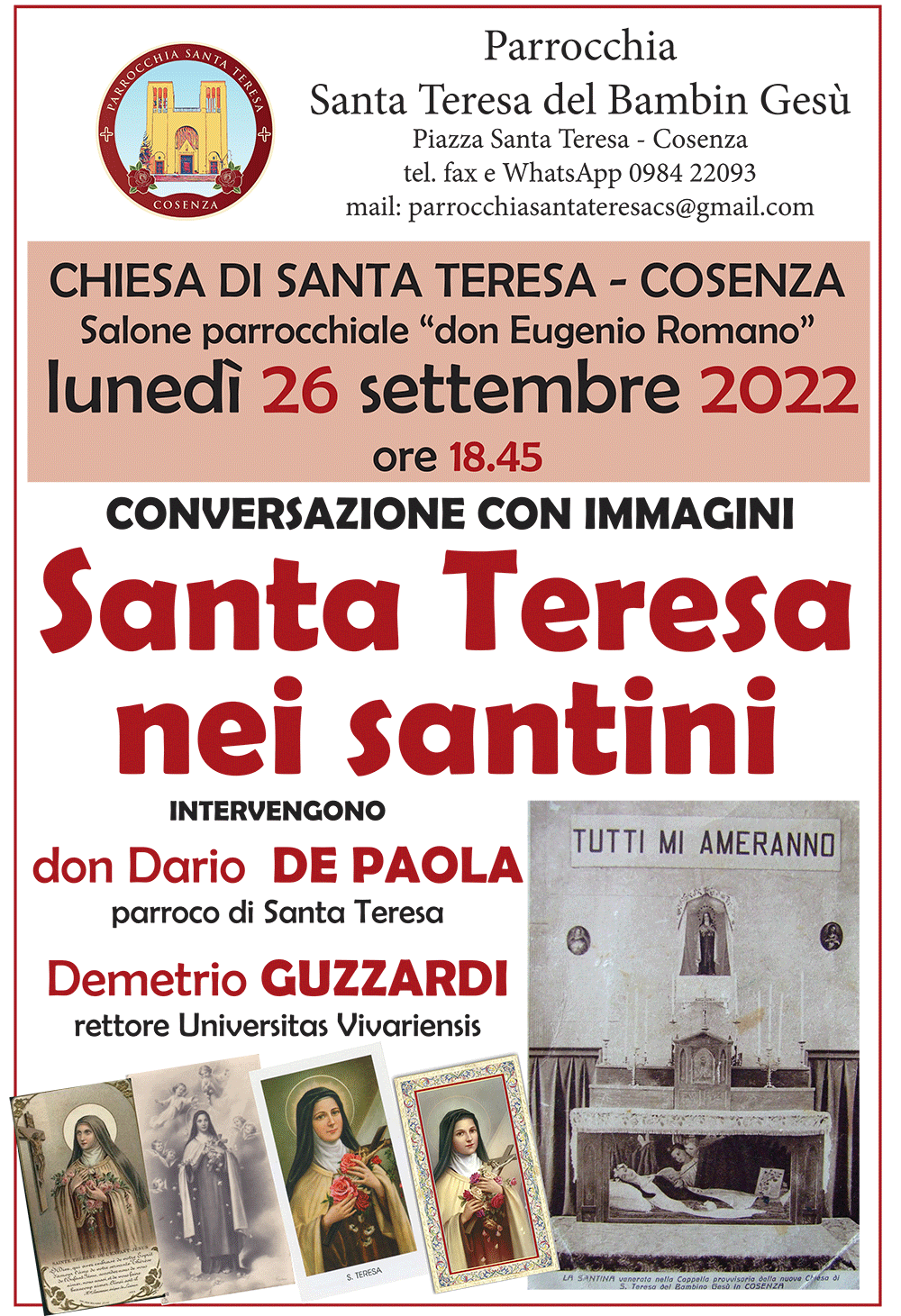 Nel corso delle iniziative per i festeggiamenti di Santa Teresa del Bambin Gesù a Cosenza, il parroco don Dario De Paola ha invitato Demetrio Guzzardi, collezionista e studioso del mondo dell’iconografia religiosa in piccolo formato, a tenere una conversazione su “Santa Teresa nei santini”, che si terrà lunedì 26 settembre 2022 alle ore 18.45 nel salone “don Eugenio Romano” della Parrocchia di Santa Teresa.