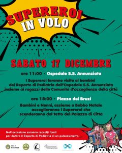 La mattina, sempre di sabato 17 dicembre, alle ore 11,00, i Supereroi faranno visita, insieme ai ragazzi delle Comunità d’accoglienza della città, al reparto di pediatria dell’Ospedale dell’Annunziata e qui consegneranno ai bambini ospiti della struttura i giocattoli offerti dall’Associazione “Niki Aprile Gatti”.