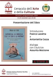 Un primo appuntamento sarà, il prossimo 25 giugno, alle ore 19,00, nella Dimora storica “Giostra Vecchia”, di proprietà di Rosa Lorenzon, la presentazione del libro “Dottoressa, la varicella esce di sera o di mattina? – Disavventure tragicomiche di una pediatra”, edito da Aliberti. Ne è autrice la pediatra Paola Di Turi che, pur essendo cosentina, vive e lavora a Bologna. Ad introdurre l’incontro con Paola Di Turi saranno Franco Laratta e Antonietta Cozza. Con l’autrice, che sta incontrando un momento di particolare notorietà in quanto molto spesso ospite di Geppi Cucciari, nella trasmissione Rai, “Splendida cornice”, dialogherà Assunta Morrone.