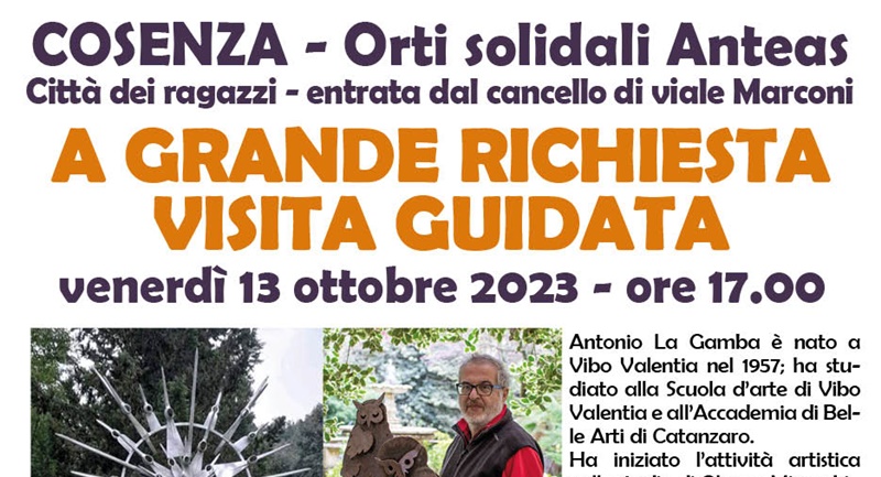 Antonio La Gamba è nato a Vibo Valentia nel 1957; ha studiato alla Scuola d’arte di Vibo Valentia e all’Accademia di Belle Arti di Catanzaro; ha iniziato l’attività artistica nello studio di Glauco Minarchi. Ha partecipato a numerose mostre collettive e personali. Da anni si dedica alla scultura, sue opere sono disseminate sul territorio italiano. Vive e opera a Vibo Valentia e Pizzo. Le sculture presenti negli Orti solidali dell’Anteas sono state realizzate utilizzando pale, picconi e vanghe; l’artista a margine della mostra ha dichiarato: «Dedico questa “strana” mostra, fortemente voluta dall’editore Demetrio Guzzardi, a mio nonno Peppe e a mio padre Domenico, sono certo che da lassù saranno felici, che mi sia finalmente dedicato alla terra, che loro hanno tanto amato e lavorato».