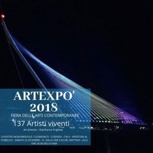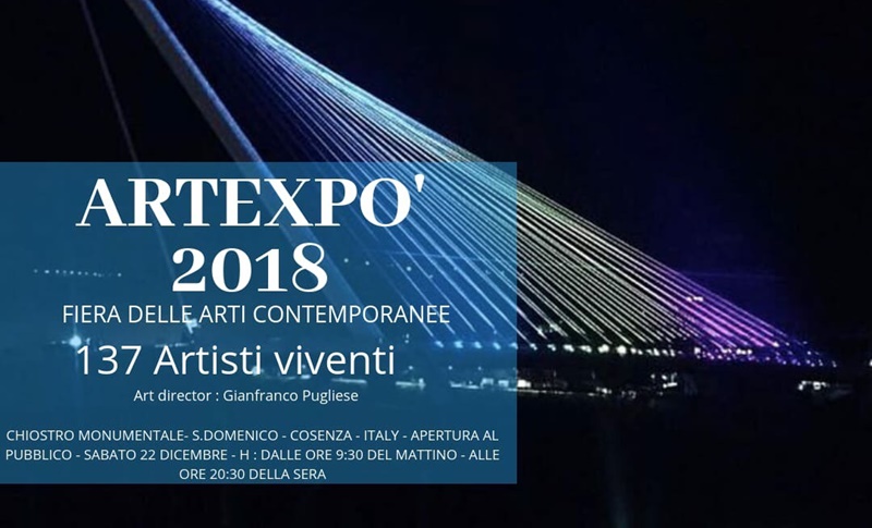 “Artexpò 2018”. E’ il titolo dell’evento in programma sabato 22 dicembre, dalle ore 9,30 alle ore 20,30, al Complesso monumentale di San Domenico. La manifestazione è una Fiera delle Arti Contemporanee che raggruppa circa 137 artisti, patrocinata dal Comune di Cosenza nell’ambito del programma più complessivo di “Buone Feste cosentine”. Art director dell’evento è Gianfranco Pugliese che, per gli aspetti più intrinsecamente turistici e di marketing del territorio connessi all’esposizione, che farà arrivare in città artisti provenienti da altri Paesi, ha coinvolto l’Assessorato al turismo guidato da Rosaria Succurro.