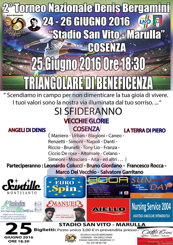 A Cosenza si terrà un triangolare di beneficenza al quale prenderanno parte gli “Angeli di Denis”, le “Vecchie glorie del Cosenza Calcio” e “La terra di Piero”. Per assistere all’incontro il biglietto ha un costo di 3€ e parte del ricavato sarà devoluto all’Associazione Verità per Denis.