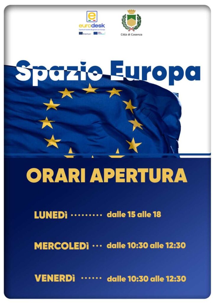 Riparte l’attività dello Spazio Europa ubicato al terzo piano di Palazzo Ferrari, nei pressi di Palazzo dei Bruzi. A darvi impulso è l’Amministrazione comunale con il Sindaco Franz Caruso e l’Assessore ai rapporti con l’Unione Europea, Veronica Buffone. Il Prof.Franco Mollo, coordinatore del Centro di Informazione europea del Comune di Cosenza, ha reso noti i giorni e gli orari di apertura dello sportello che funzionerà tre giorni a settimana: il lunedì, dalle 15,00 alle 18,00, mentre il mercoledì e il venerdì l’apertura è garantita dalle 10,30 alle 12,30.